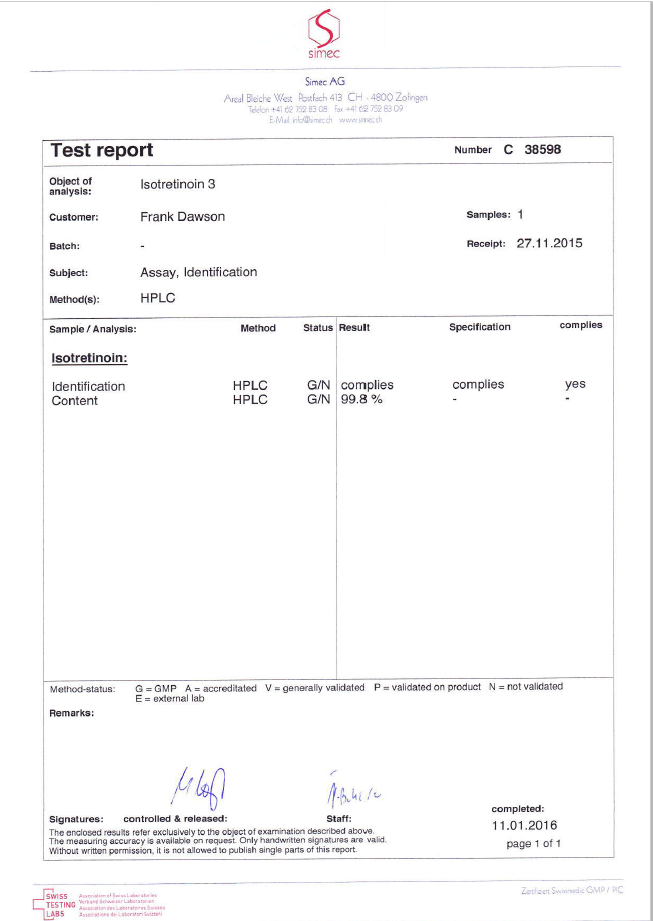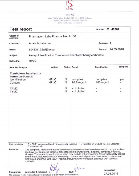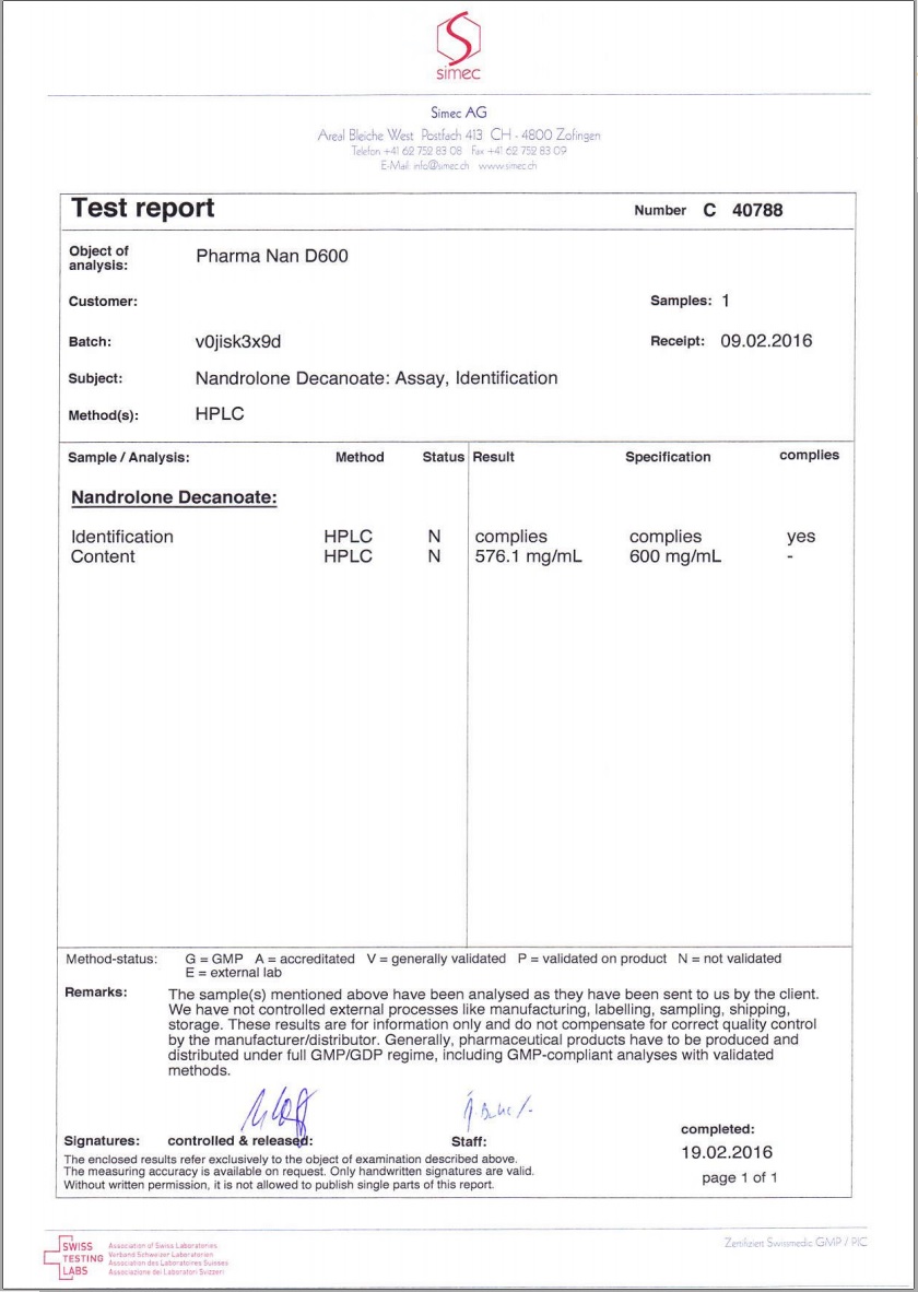 Todos os testes cromatográficos foram realizados por um laboratório independente, acreditado e certificado pelas GMP, a Simec AG (www.simec.ch). Todos os resultados são verificáveis! Cada relatório contém seu número individual; por exemplo, C34804 para Boldenone Undecylenate. Você pode, a qualquer momento, entrar em contato diretamente com a Simec e informar o número do relatório específico para verificar a autenticidade do documento.